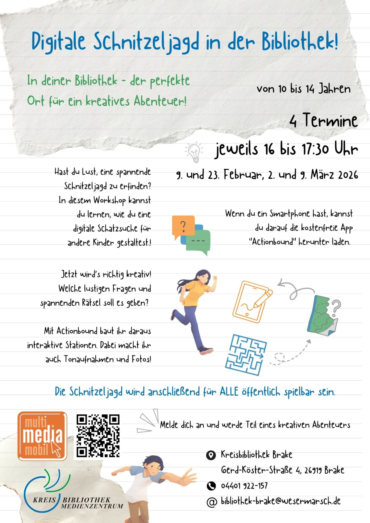 Die Kreisbibliothek Brake lädt Kinder im Alter von 10 bis 14 Jahren zu einer kreativen Veranstaltungsreihe ein: Gemeinsam mit dem Multimediamobil Nordwest entsteht im Februar und März eine digitale Schnitzeljagd mit der App Actionbound.
