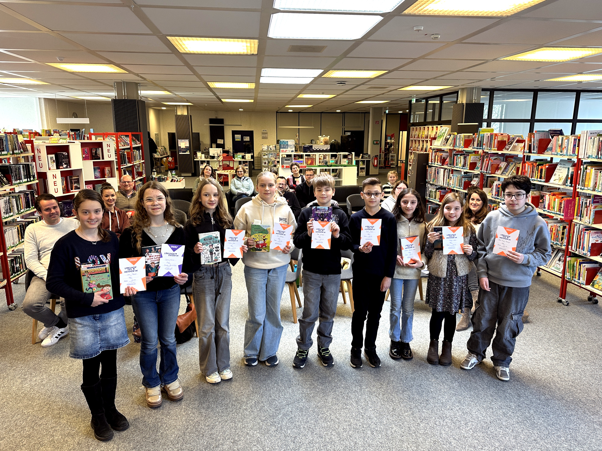 Sie sind die besten Vorleserinnen und Vorleser ihres Jahrgangs an ihren Schulen: Pauline Grah, Dimitri Maul, Fatima Alzahraa Dayen, Emin Yacar Demiray, Pia Pittwohn, Mika Schannen, Lena Thamer, Charlie Kähne und Sophia Fischer. Beim Kreisentscheid des diesjährigen Vorlesewettbewerbs traten sie am Vormittag in der Kreisbibliothek gegeneinander an – und lieferten erstaunliche Leistungen ab.